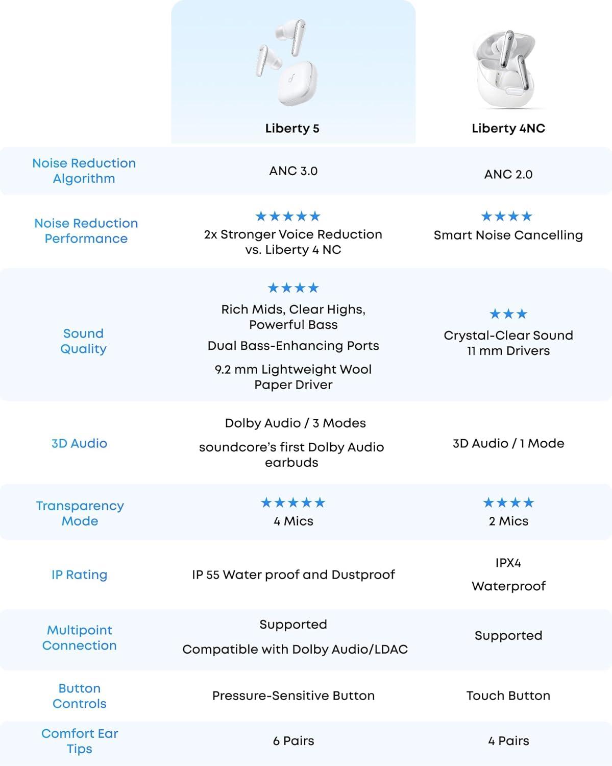 2× Stronger Voice Reduction vs Liberty 4 NC: Upgraded ANC 3.0 technology and a redesigned acoustic cavity target and reduce human voices 2× more effectively than Liberty 4 NC, helping you stay focused and enjoy quieter commutes on trains or subways.