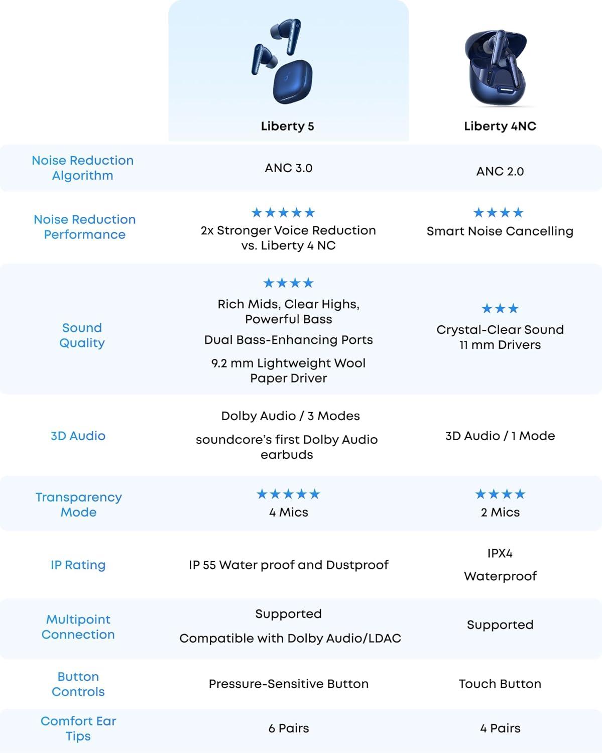 2× Stronger Voice Reduction vs Liberty 4 NC: Upgraded ANC 3.0 technology and a redesigned acoustic cavity target and reduce human voices 2× more effectively than Liberty 4 NC, helping you stay focused and enjoy quieter commutes on trains or subways.